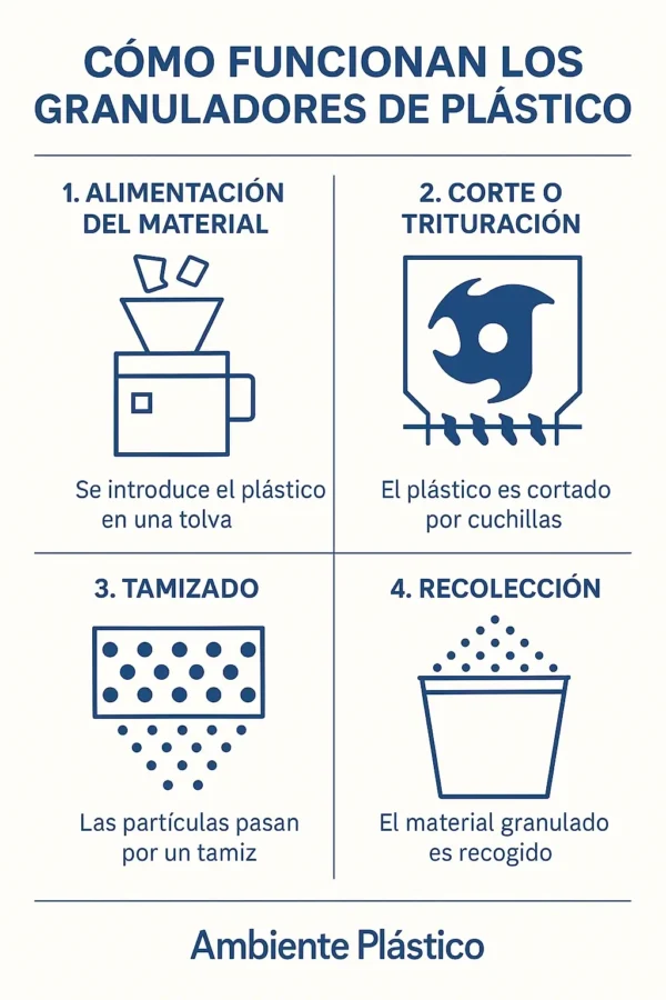 Los granuladores de plástico son equipos industriales que reducen el tamaño de los residuos plásticos hasta convertirlos en partículas uniformes, conocidas como granzas o pellets.