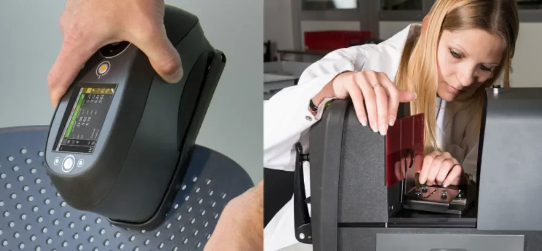 - Medir con espectrofotómetros portátiles y de mesa que capturan el color en superficies transparentes, translúcidas, reflectantes, texturizadas y tratadas con abrillantadores ópticos.